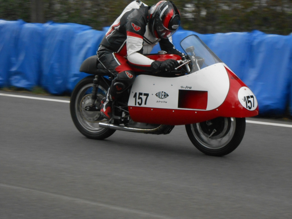 The impressive fully enclosed 1957 500cc Gilera Saturno Corsa Competizione of Urs Ruegg keeping ahead of a Manx Norton on the straight.