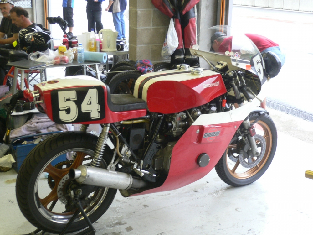 Just a few of the tremendous turn out of Kawasaki racers fill this pit garage.