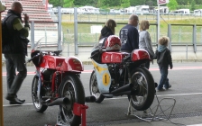 The Autohaus Sellmann Ducati Mike Hailwood Replica racer getting checked over before final practice.