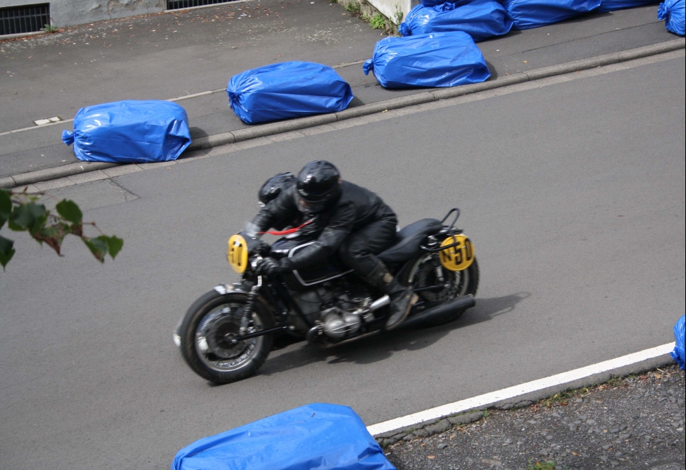 Gerhard Ruffner and Nadine Pfeiffer on their BMW R69S (N44) leaving the hairpin together with Uwe Stroinski and Detlev Fenske, BMW R51/3 (N5) and Helmut Wittgens and Klaudia Hecht, BMW R51/3 (N11)