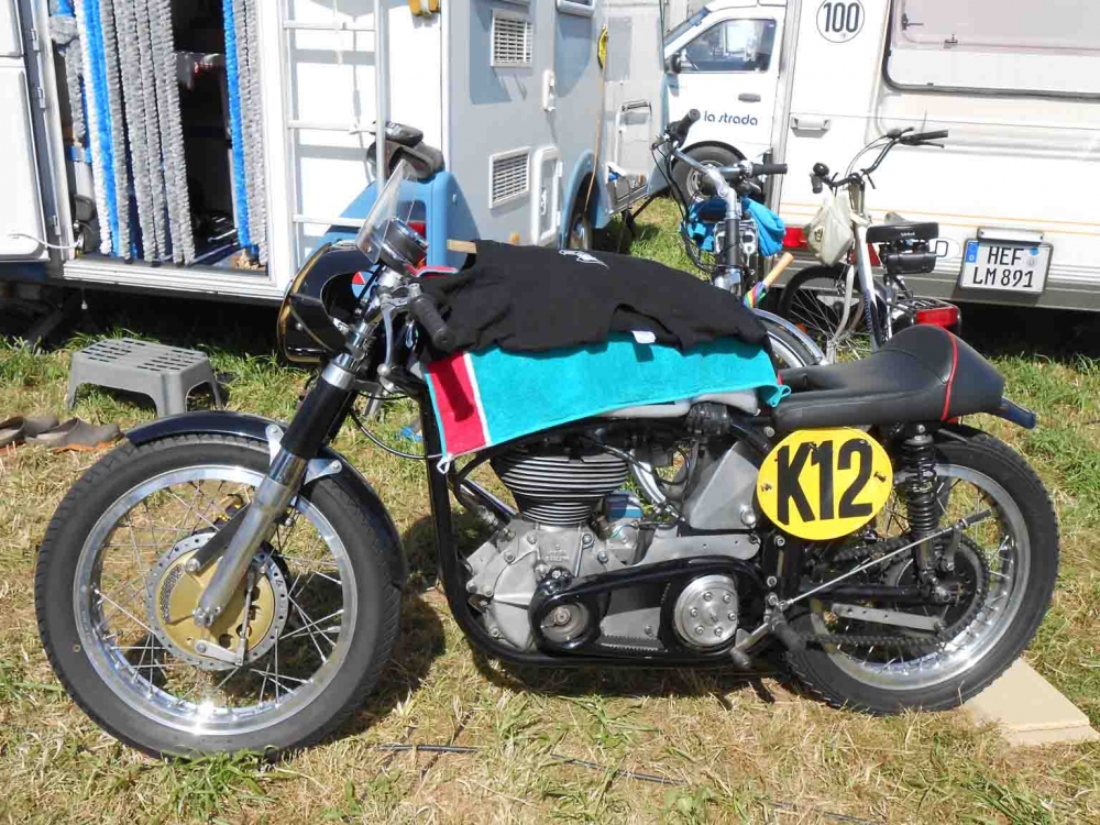 The 1957 498cc Manx 30 Norton of Rudolf Seydewitz gets protection from the sun with some damp towels. I think many of the visitors wished they could have the same treatment.
