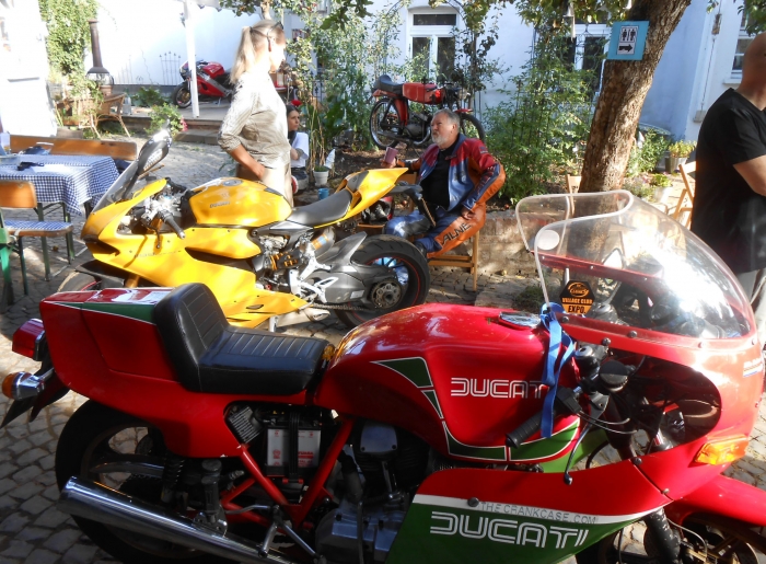 Andreas on his 'cafe' modified Ducati 996 arrived with 6 other riders accompanied by the rattling of the Ducati dry clutches.